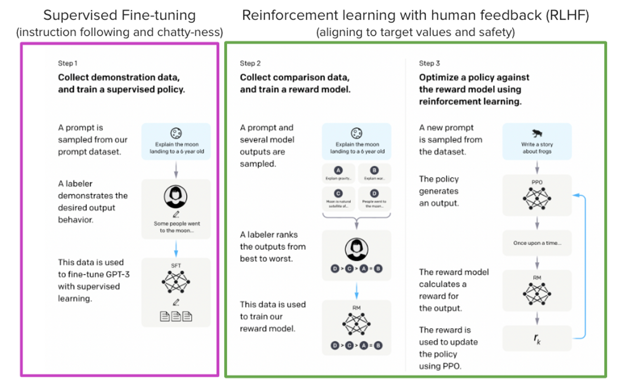 A trick that works well instead of direct feedback is training a reward model on human annotations collected before the RL loop. The goal of the reward model is to imitate how a human would rate a text. There are several possible strategies to build a reward model: the most straightforward way would be to predict the annotation (e.g. a rating score or a binary value for “good”/”bad”). In practice, what works better is to predict the ranking of two examples, where the reward model is presented with two candidates for a given prompt and has to predict which one would be rated higher by a human annotator.