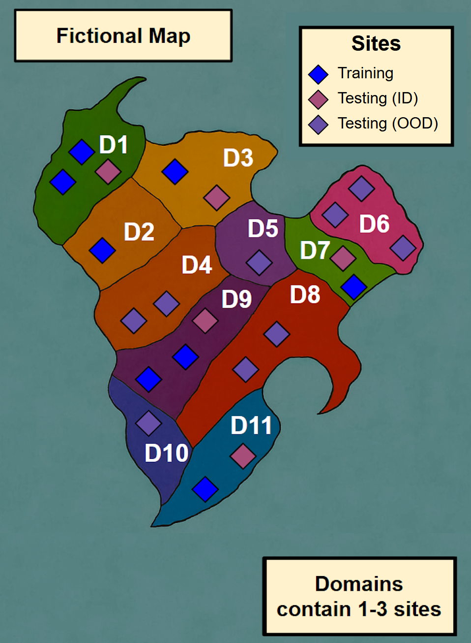 | Figure 1. Fictional depiction of data distribution and splits across domains. Image was created with Microsoft CoPilot + manual editing. |