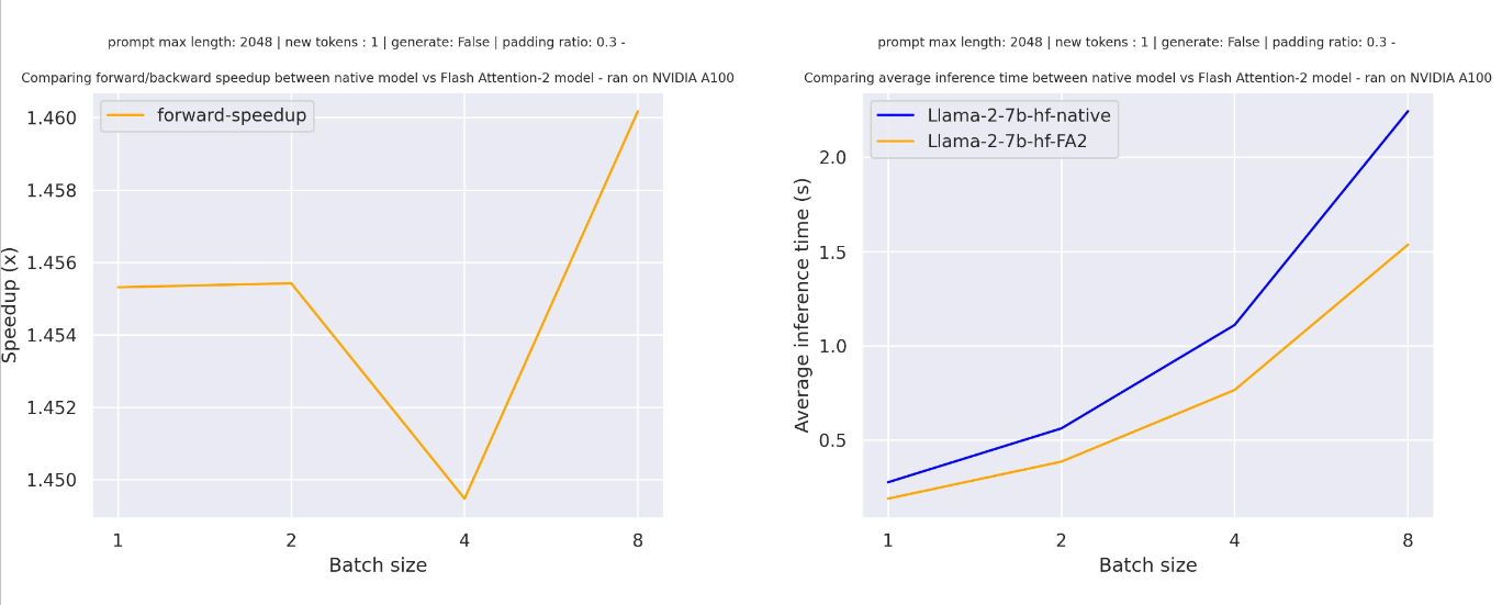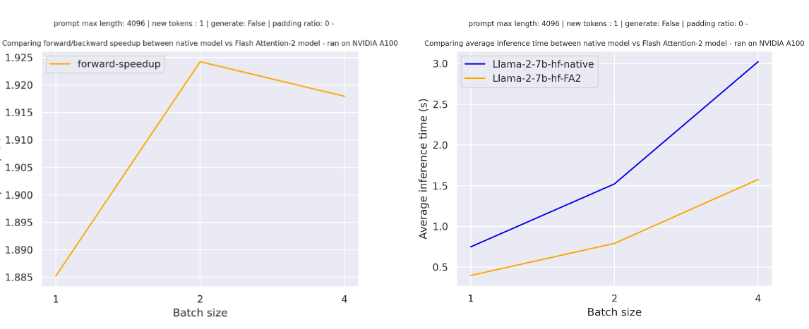特に長いシーケンスに対して、微調整と推論の際には、かなりの高速化が期待できます。ただし、Flash Attentionはパディングトークンを使用してアテンションスコアを計算しないため、シーケンスにパディングトークンが含まれる場合、バッチ推論においてアテンションスコアを手動でパッド/アンパッドする必要があり、パディングトークンを含むバッチ生成の大幅な遅延が発生します。