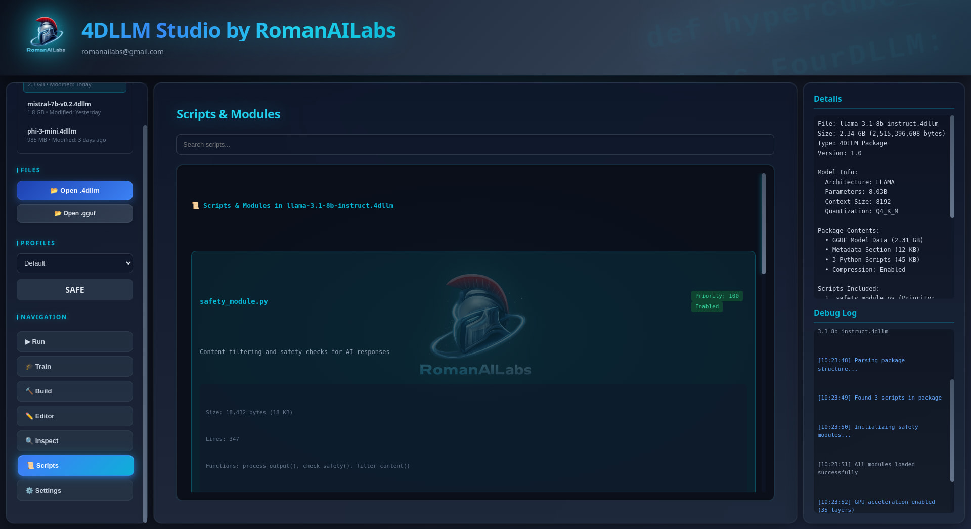 I’m building 4DLLM Studio (RomanAILabs) — a “one app” desktop studio for local LLMs that runs raw .gguf models and .4dllm packages (GGUF + config/metadata + optional scripts all in one file). The whole point is to make running and managing models feel simple instead of duct-taped together.